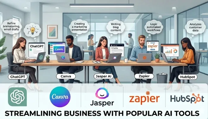 popular AI tools for business like ChatGPT Canva Jasper Zapier and HubSpot used by professionals in office